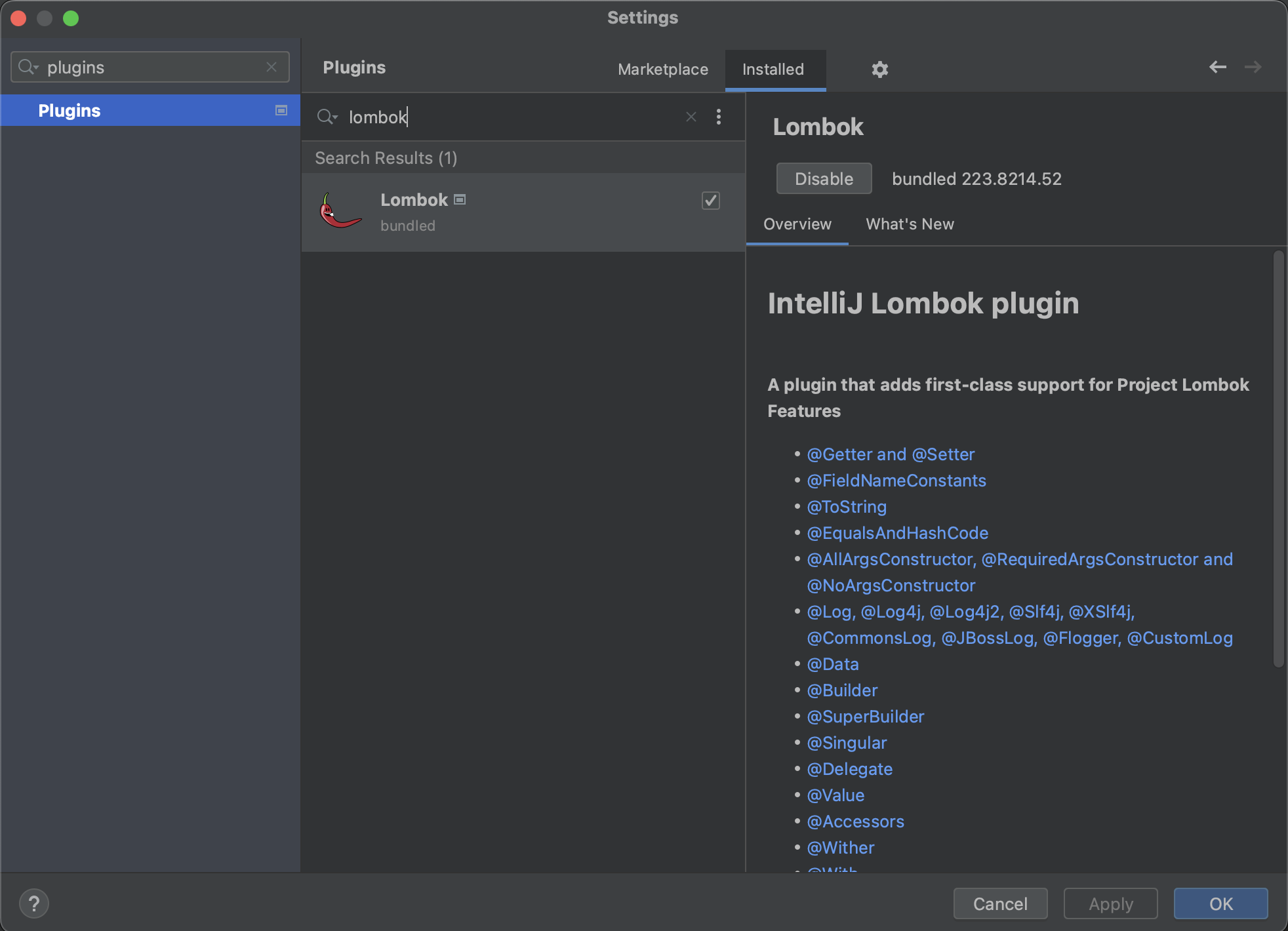 2) Settings -> plugins 검색하여 해당 메뉴에서 Lombok 라이브러리를 검색하여 설치