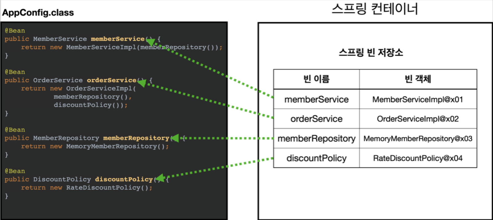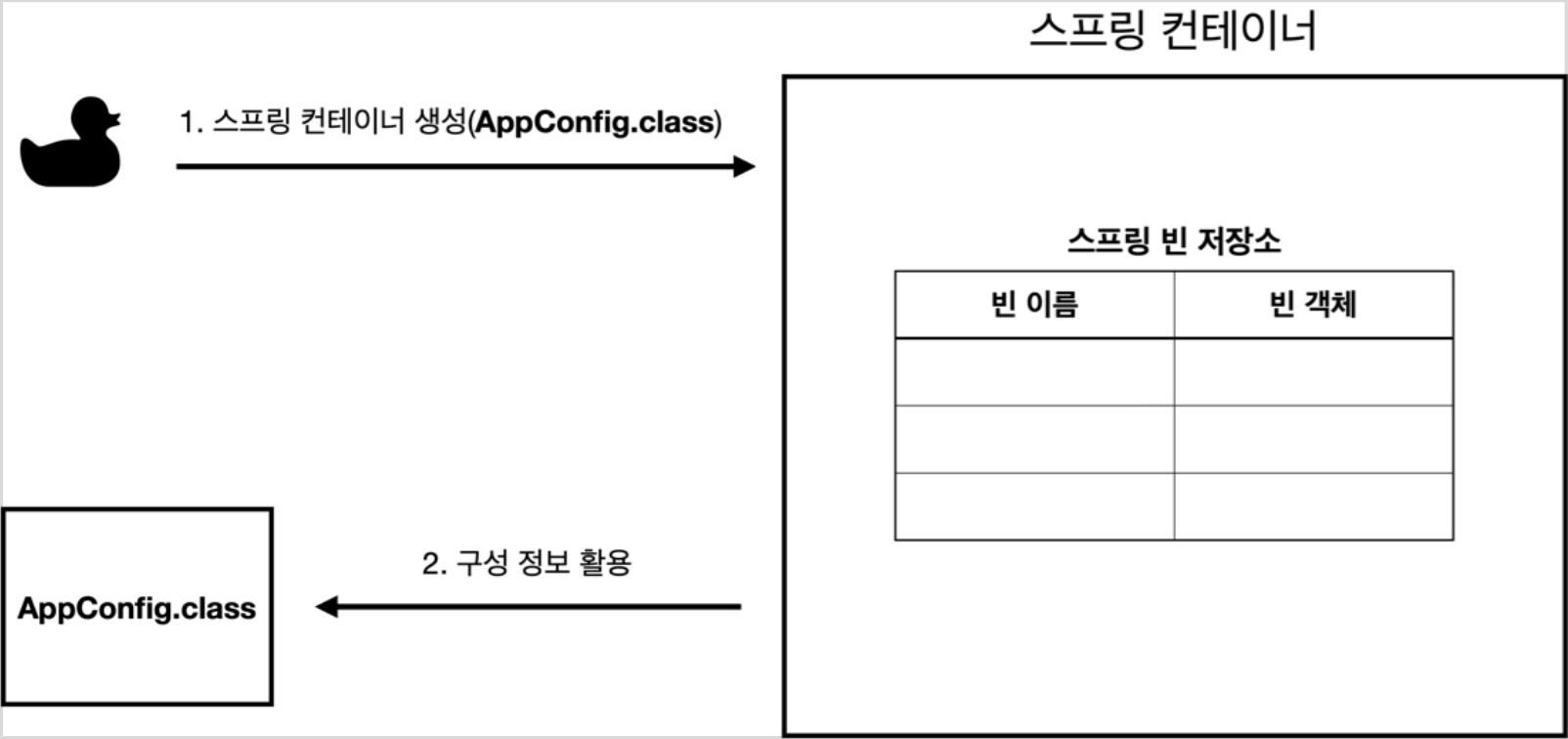 - 스프링 컨테이너는 파라미터로 넘어온 설정 클래스 정보를 사용해 스프링 빈을 등록한다.(@Bean 이용하여 빈 등록)