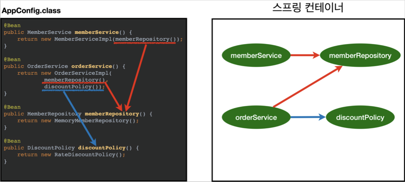 위의 이미지에서는 memberService와 orderService를 생성하기 위해 memberRepository, discountPolicy와의 의존관계가 필요한데 이러한 정보를 AppConfig.class를 통해 빈에 등록했기 때문에 의존관계가 주입된다.