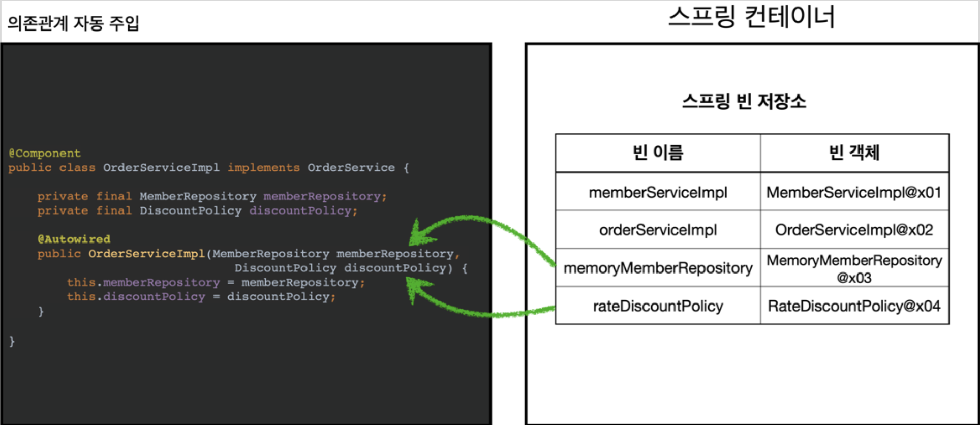 - AppConfig에서는 @Bean으로 직접 설정 정보를 작성했고, 의존관계도 직접 명시했다. 이제는 이런 설정 정보 자체가 없기 때문에 의존관계 주입도 이 클래스 안에서 해결해야 된다.