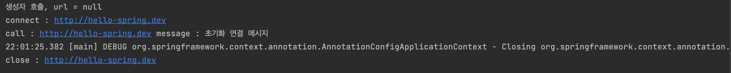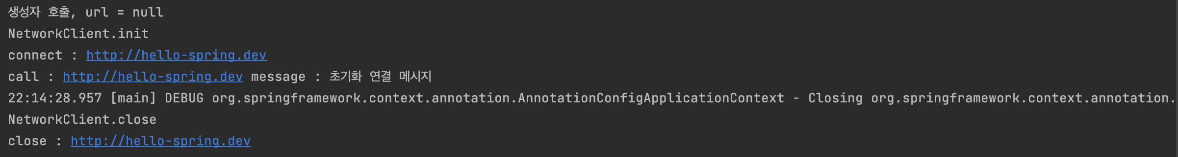 - 스프링 컨테이너의 종료가 호출되자 소멸 메서드가 호출된 것을 알 수가 있다.