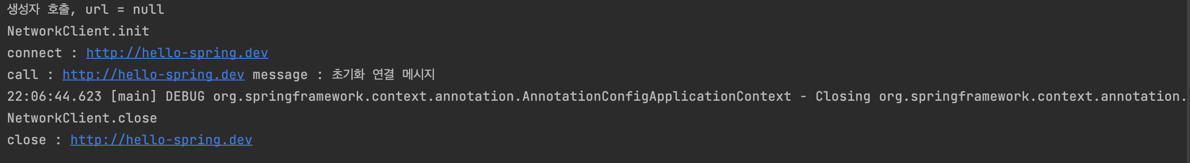 해당 예제 코드를 통해서 실제로 네트워크에 연결하는 것은 아니고 단순히 문자만 출력하여 외부 네트워크에 미리 연결하는 객체를 하나 생성한다고 가정해 보자 이 NetworkClient는 애플리케이션 시작 시점에 connect()를 호출해서 연결을 맺어두어야 하고, 애플리케이션이 종료가 되면 disConnect()를 호출해서 연결을 끊어야 한다.
